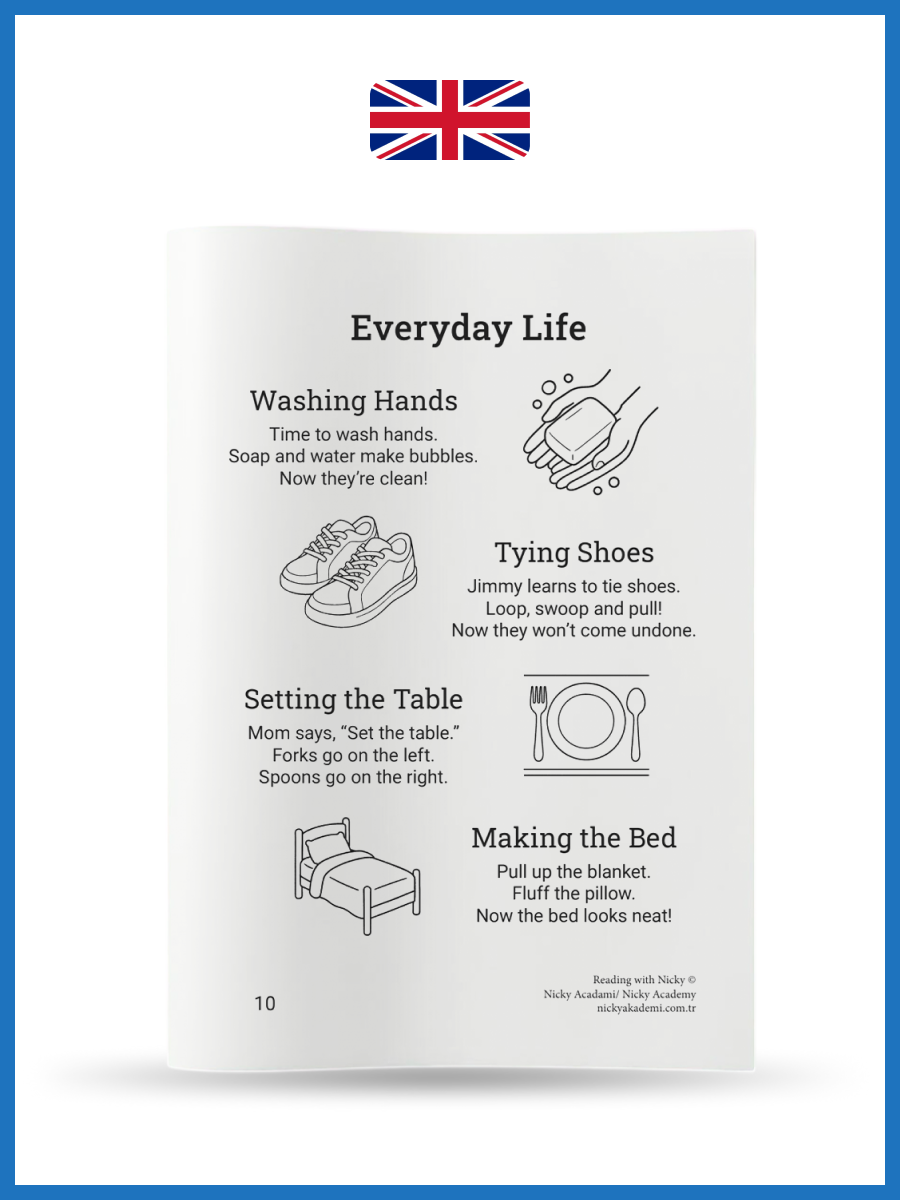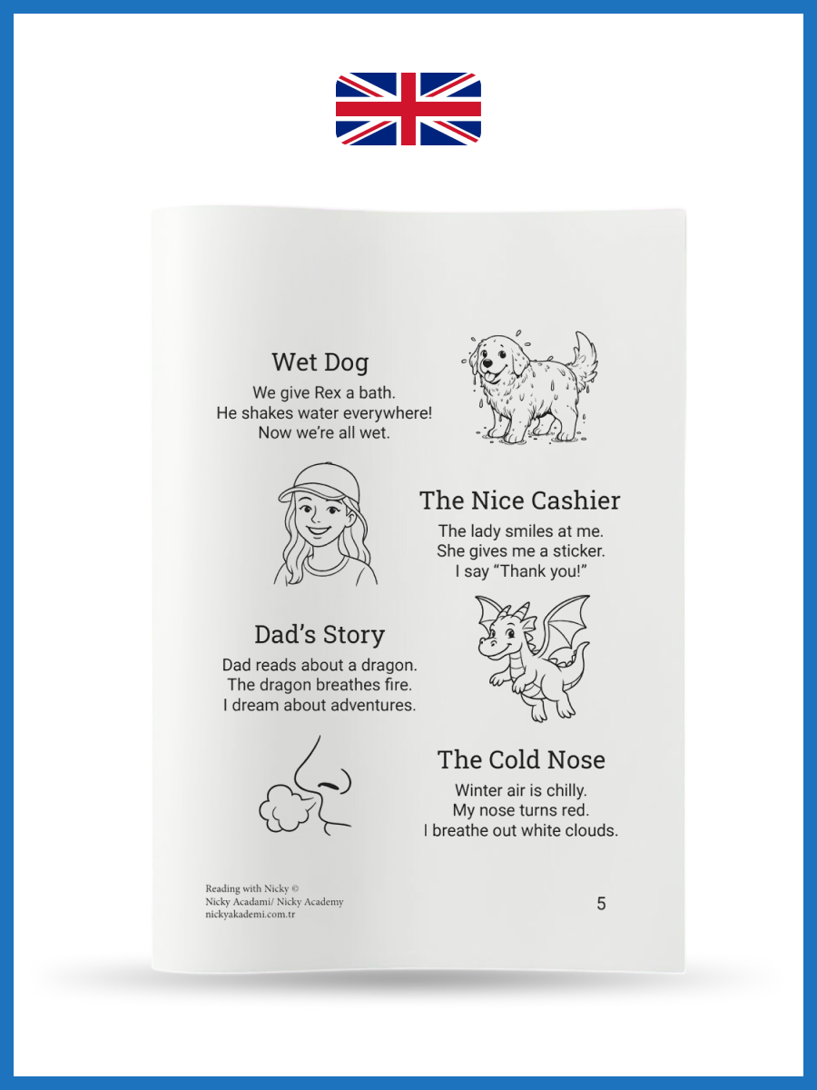 Master English step-by-step! 10 fun levels: Start with super-short stories (3-4 sentences + coloring picture) and grow to confident reading. Each page has 4-5 mini-tales.