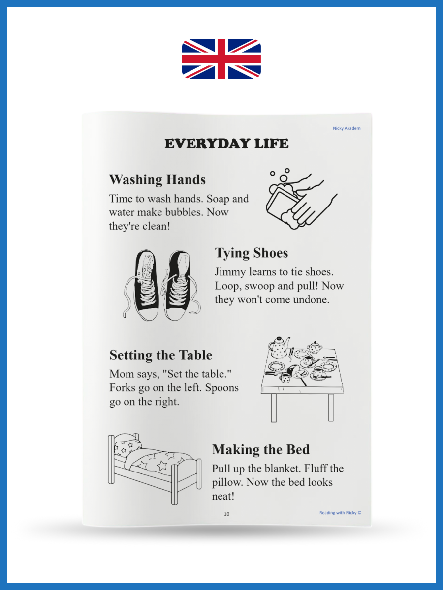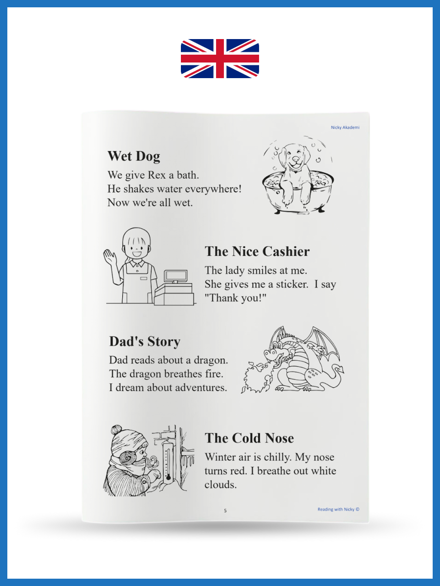 Master English step-by-step! 10 fun levels: Start with super-short stories (3-4 sentences + coloring picture) and grow to confident reading. Each page has 4-5 mini-tales.