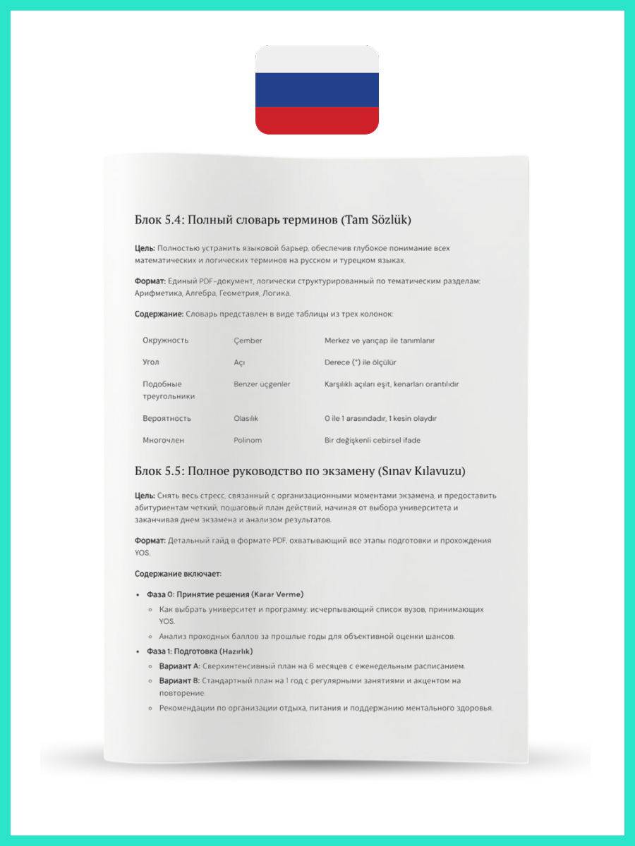 Full support: Rules, schedules, and preparation schedules will help you structure your learning process. We have also included all the necessary information about the exam, procedures, documents, and a glossary of specialised terms in Turkish.