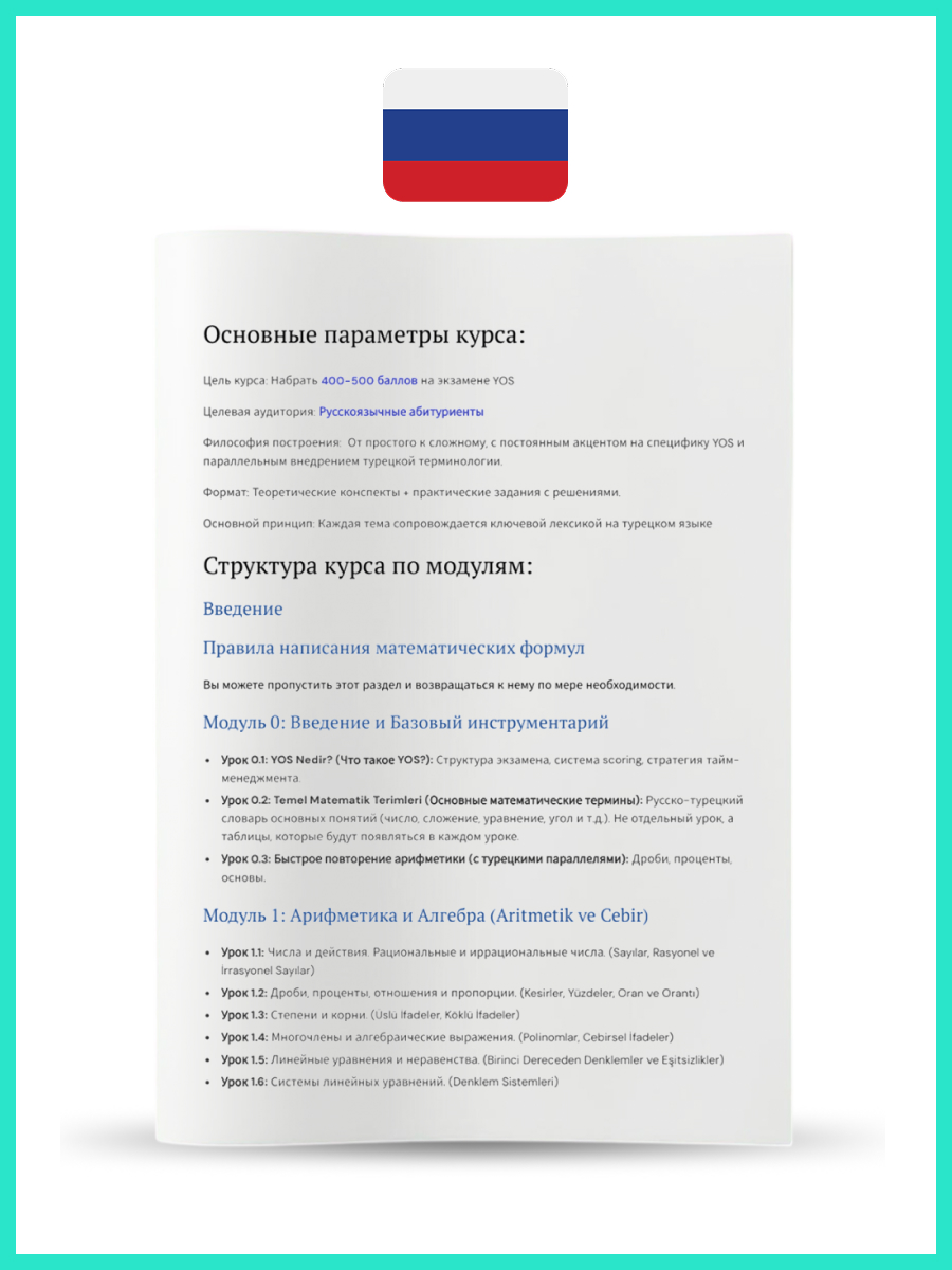 Language of presentation: The entire course is written in Russian with parallel Turkish terms, making it as accessible as possible for students from CIS countries.