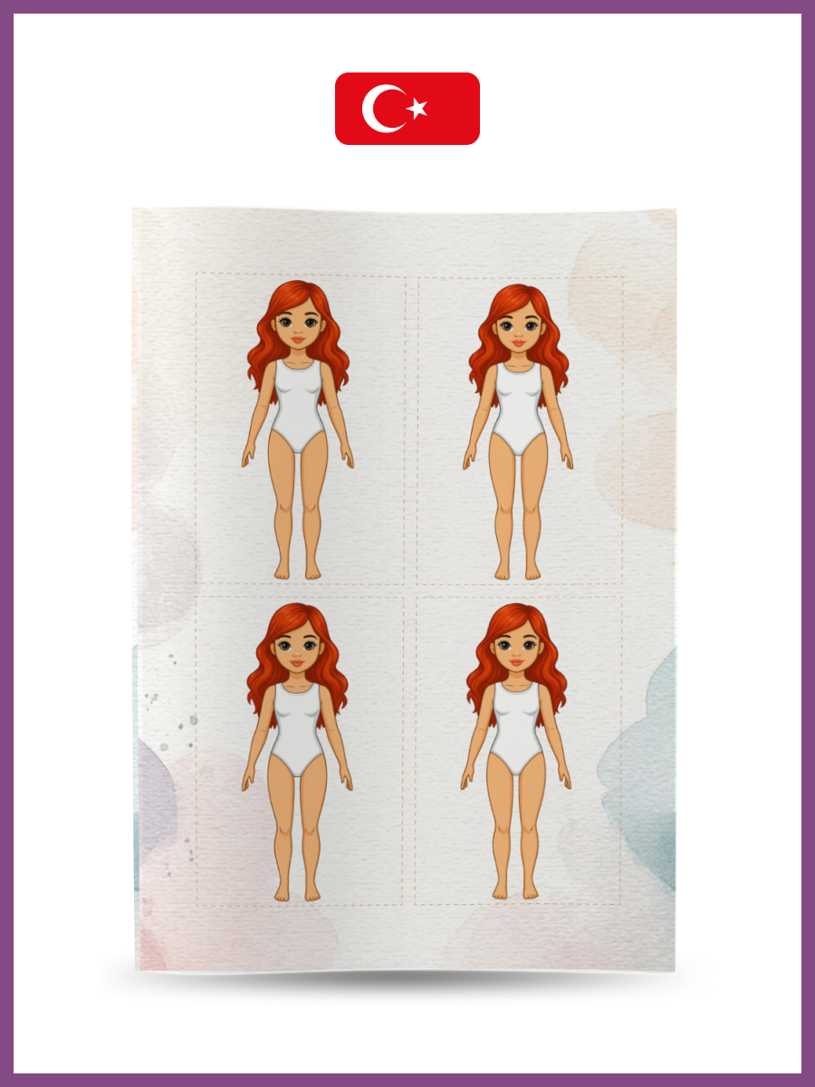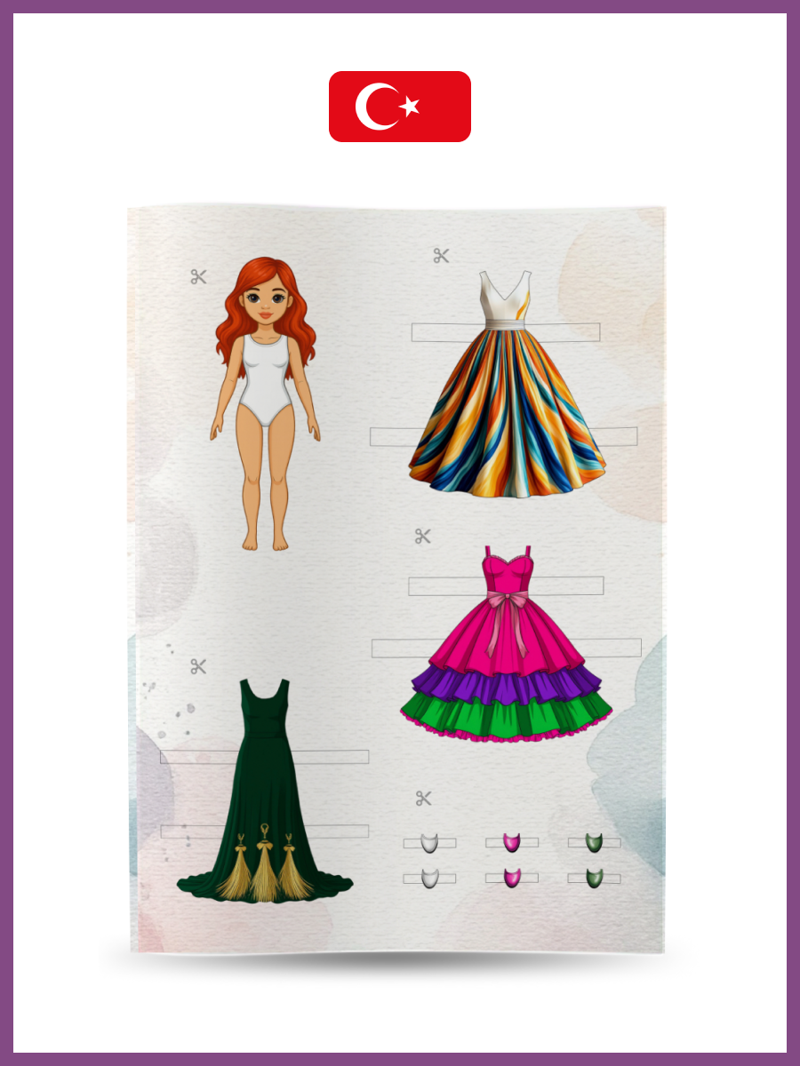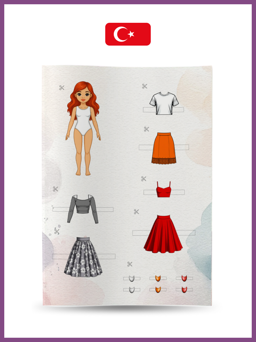 12 cm kağıt bebekler. Bebekleri ve giysileri kağıttan emniyet makasıyla dikkatlice kesin, bu işlem için yetişkinlerden yardım isteyin. Ardından farklı giysi koleksiyonlarıyla bebekleri giydirerek oynayın — kombinleyin, eşleştirin, hayal gücünüzü kullanın ve eğlenin!