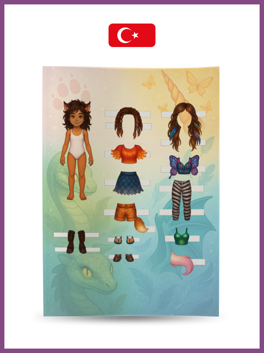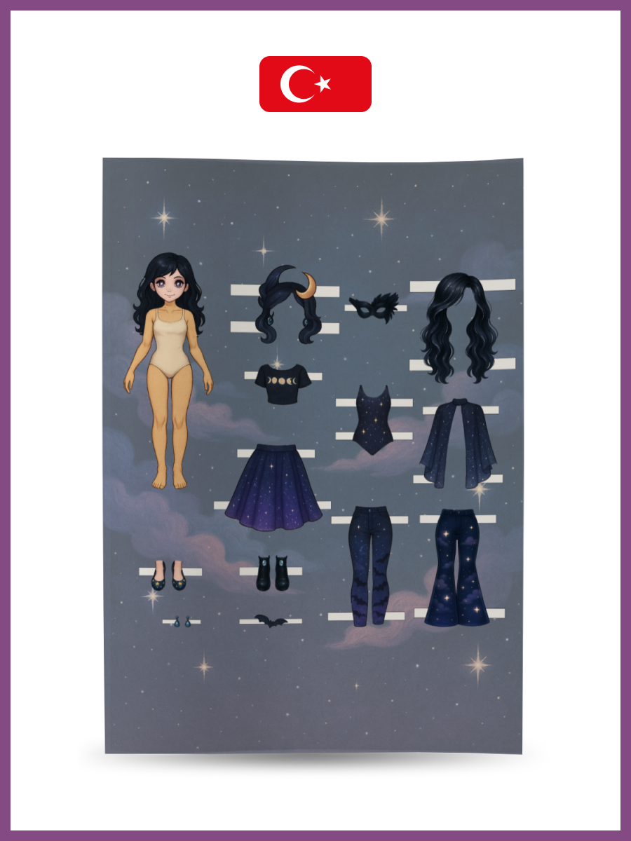 12 cm kağıt bebekler. Bebekleri ve giysileri kağıttan emniyet makasıyla dikkatlice kesin, bu işlem için yetişkinlerden yardım isteyin. Ardından farklı giysi koleksiyonlarıyla bebekleri giydirerek oynayın — kombinleyin, eşleştirin, hayal gücünüzü kullanın ve eğlenin!