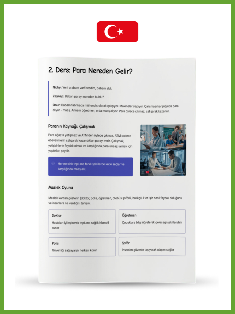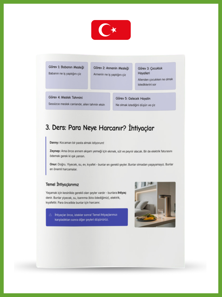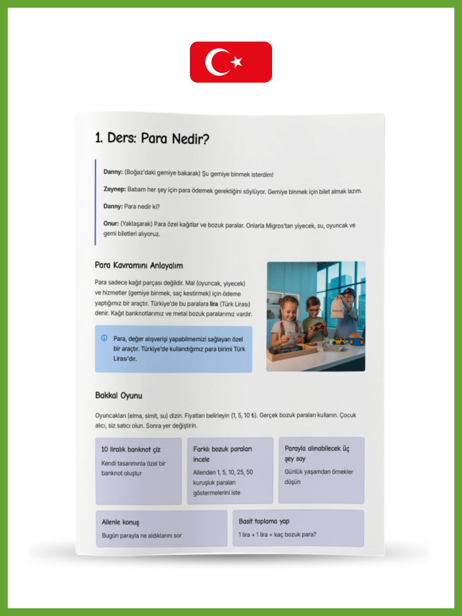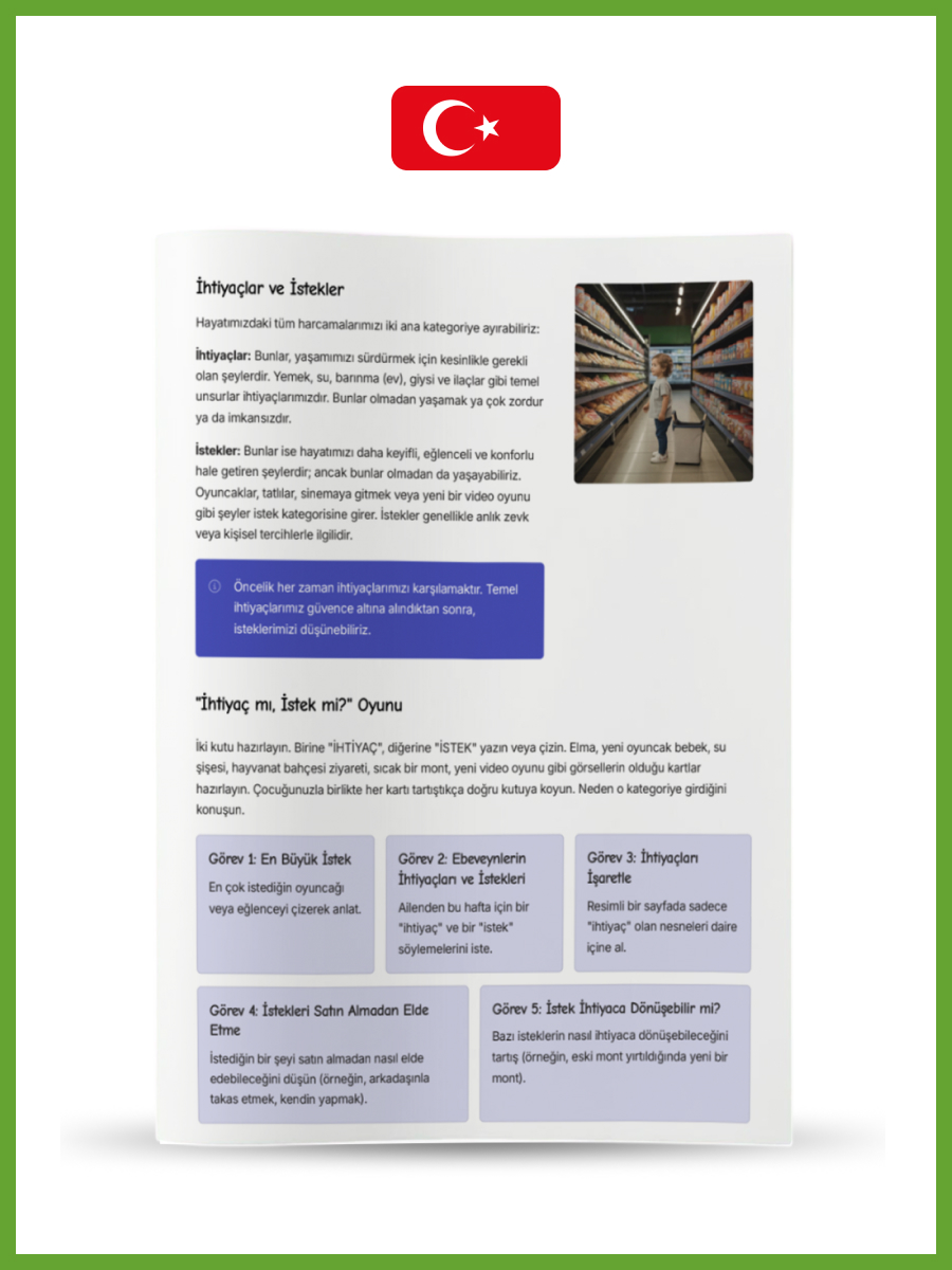 Seviye 1 (5-6 Yaş): Masallar ve oyunlarla para saymayı öğrenir, “istemek” ile “ihtiyaç duymak” arasındaki farkı anlar ve emeğin değerini kavrarız.