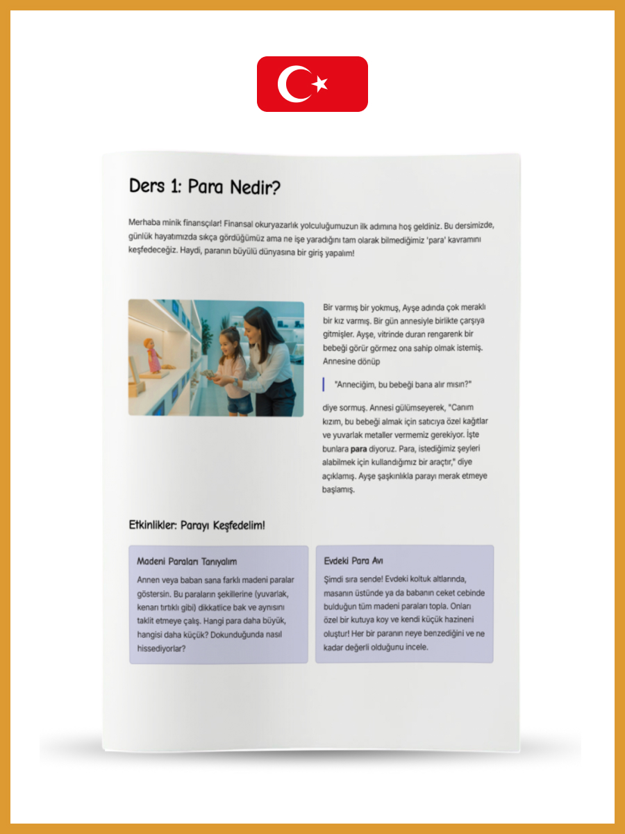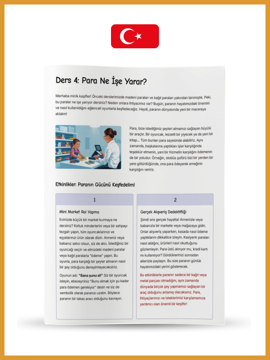 Seviye 1 (5-6 Yaş): Masallar ve oyunlarla para saymayı öğrenir, “istemek” ile “ihtiyaç duymak” arasındaki farkı anlar ve emeğin değerini kavrarız.