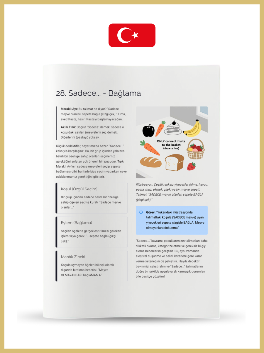Konu Kapsamı: Açıklamanıza tam uyum: Derinlemesine nedensellik, koşullu ifadeler (Eğer-İse), mantıksal bağlaçlar (VE, VEYA, DEĞİL, kombinasyonlar), algoritmalar, basit çıkarımlar (tümceler), eleme bulmacaları (3×3 tablolar), mantık hatalarını tespit etme ve final görevi.